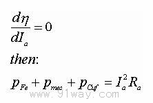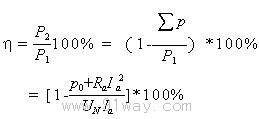 1)轉速特性 當U=U,I=If時,n=f(Ia)的關系曲線 n=(U/Ceφ)-(RaIa/Ceφ) 2)轉矩特性 當U=U,If=IfN時,Tem=f(Ia)的關系曲線 Tem=CTφIa 3)效率特性 當U=UN,If=IfN時,η=f(Ia)的關系曲線 (1)銅耗 電流流過導體時,消耗在電阻內的損耗; 其次是勵磁回路的銅耗pcuf=IfRf;還有電刷接觸損耗 (2)鐵耗 電動機的主磁通在磁路的鐵磁材料中交變時所產生的損耗 (3)機械損耗 機械損耗包括軸承及電刷的摩擦損耗和通風損耗 (4)附加損耗 附加損耗p△又稱雜散損耗 附加損耗主要包括: *(電樞鐵心上齒槽存在,使氣隙磁通大小脈振和左右搖擺在)鐵心中引的鐵損耗; *電樞反應使磁場畸變引起的電樞鐵耗 *換向電流產生的銅耗等 因為難于精確計算 *對無補償繞組的直流電機,附加損耗按額定容量1%估算 *對有補償繞組的直流電機,附加損耗按額定容量0.5%估算 對于并勵直流電動機 因為磁通基本不變,轉速基本不變,所以勵磁損耗、鐵耗和機械損耗可以認為不變.如果不計附加損耗,效率為: