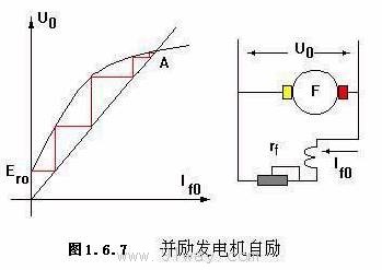 因為空載特性表明的是直流電機磁路特性 所以對于并勵和復勵發電機空載特性也以他勵方式測取 2.并勵和復勵直流發電機空載電壓的建立 1)空載電壓的建立 對于勵磁繞組的端電壓Uf和勵磁電流Ir 若從電機磁路關系上考慮要滿足空載特性, 即U0=f(If0) 而從電路關系上觀察,必須遵循伏安特性, 即Uf=rf*If0 由此可見,U0、If0必須同時滿足(1-81)和(1-82)