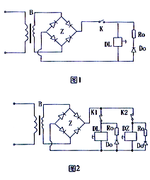 <一> 基本控制電路 1、離合(制動)器控制電路(圖1)及離合制動器總成 控制電路(圖2) B-變壓器 Z-整流器 K、K1、K2-轉換開關、按鈕或接觸器觸點 DL-離合器線圈 DZ-制動器線圈 RO-電阻 D0-二極管 |