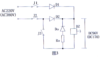 2、失電制動器基本控制電路(圖3) Rf-分壓電阻 C-電容 J.J1~J5-接觸器觸點 D1~D5整流二極管 RX-限流電阻 B-變壓器 Do-二極管 Ro-電阻 |