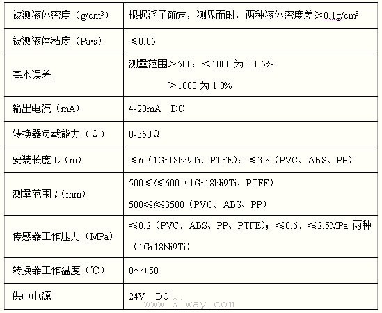 傳感器的工作基于浮子的浮力及磁性原理。當浮子隨著液位(界面)上下浮動,浮子內(nèi)永磁體的磁力作用于導管內(nèi)的干簧管,使相應高度的干簧管閉合,得到正比于液位的電壓信號,經(jīng)轉(zhuǎn)換器轉(zhuǎn)換成4~20mA.DC的標準信號。