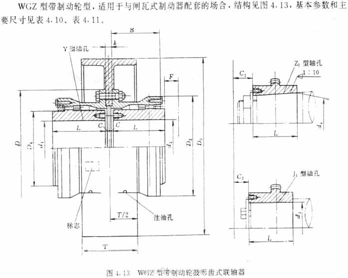 注:1、質(zhì)量與轉(zhuǎn)動(dòng)慣量是按最大直徑的Y軸孔計(jì)算的近似值,未計(jì)算制動(dòng)輪。 2、錐型軸孔最大軸徑至220mm。 3、不同制動(dòng)輪直徑的C、C1、C2植為表中數(shù)值再加K/2,k值見表4.11 | |||||||||||||||||