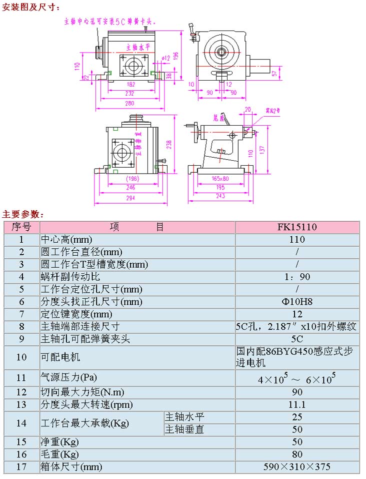 FK15110數控、立臥兩用型分度頭是數控機床、加工中心等機床的主要附件之一,亦可作為半自動銑床、鏜床或其它類機床的主要附件。該分度頭與相應的CNC控制裝置或機床本身特有的控制系統連接,并與4-6巴壓縮氣接通,可自動完成工件的夾緊、松開和任意角度的圓周分度工作。