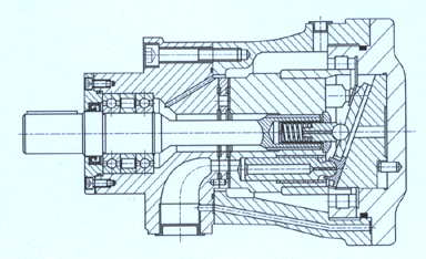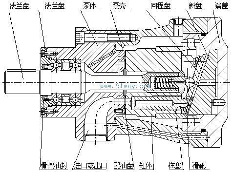主體部分由傳動軸帶動缸體旋轉,使均勻分布在缸體上的七個柱塞繞傳動軸中心線轉動,通過中心彈簧將柱滑組體中的滑靴壓在變量頭(或斜盤)上。這樣柱塞隨著缸體的旋轉而作往復運動,完成吸油和壓油動作。