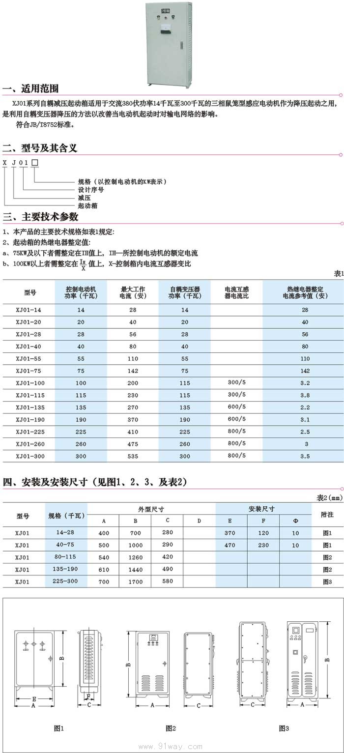 XJ01系列自耦減壓起動箱適用于交流380v,功率至300kw的三相鼠籠感應電動機作為降壓起動之用,系利用自耦變壓器降壓的方法以改善當電動機起動時對輸電網絡的影響。