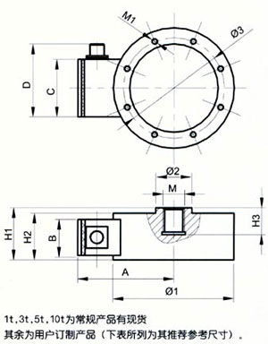 | 量程(t) | ø1 | ø2 | ø3 | H1 | H2 | H3 | M | M1 | A | B | C | D |