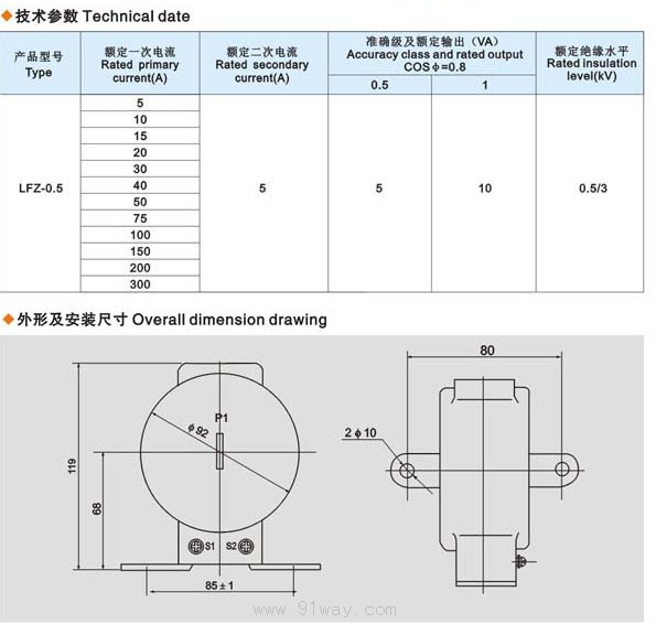 LFZ-0.5型電流互感器技術參數及安裝尺寸