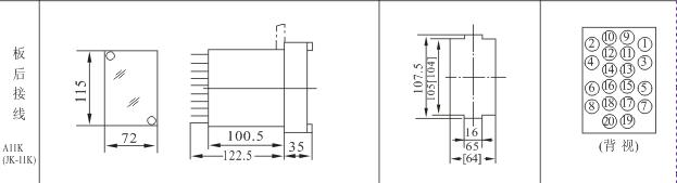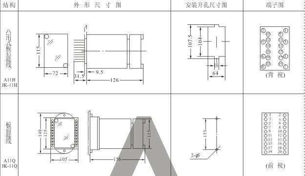 該繼電器為集成電路式晶振、分頻原理。殼體組件代號:嵌入式后接線結構為A11K,凸出式后接線結構為A11H,凸出式前接線結構為A11Q。