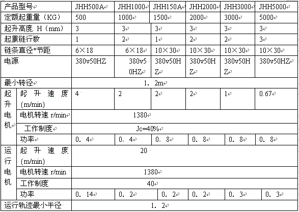 JHH型環鏈電動葫蘆體積小、重量輕、價格便宜、廣泛用于低矮廠房或不使用架設橋式起重機的場所,能提高工作效率,減輕勞動強度效率高。 起重量:0.25噸,0.5噸 ,1噸,1.6噸,2噸,3.2噸。 起升高度:3米。 主要性能及指標