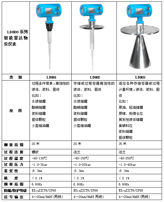 LD800系列雷達物位計適用于對液體、漿料及顆粒料的物位進行非接觸式連續測量,適用于溫度、壓力變化大;有惰性氣體及揮發存在的場合。