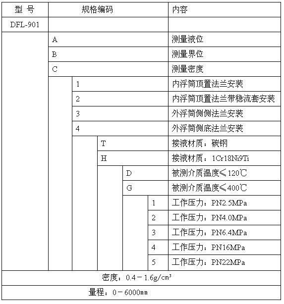 產品選型表:浮筒液位變送器