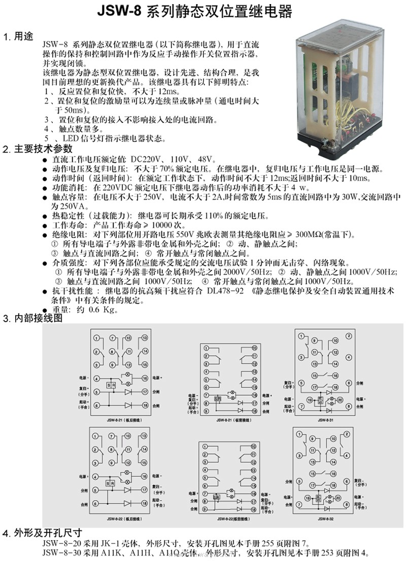 繼電器動(dòng)作和復(fù)歸后的直流功率消耗在220V額定電壓下不大于1W。
