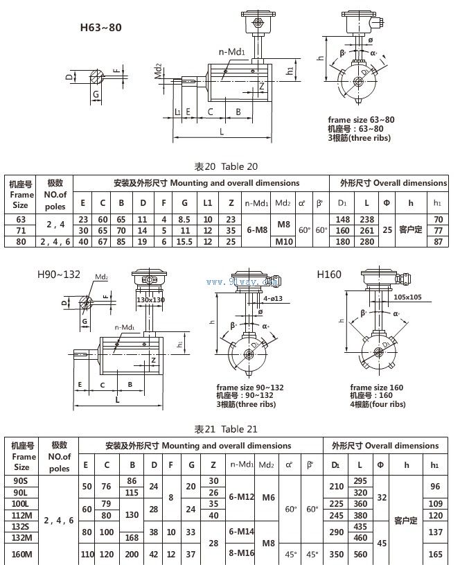 機座無底腳,端蓋無凸緣,機座有3或4根筋,借筋接觸安裝電動機,帶外接接線盒。