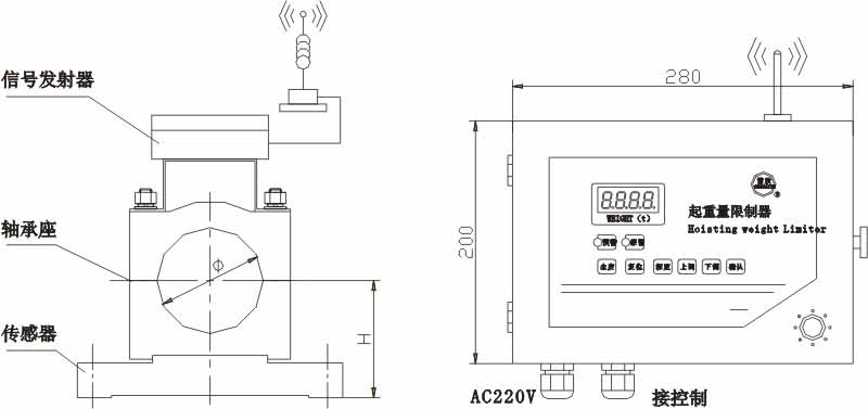 QCX-2W型起重量限制器儀表是在2M型基礎(chǔ)上改進的,實現(xiàn)傳感器信號無線傳輸給儀表。儀表分為兩部分:主儀表(接收信號顯示并控制)和無線發(fā)射器。