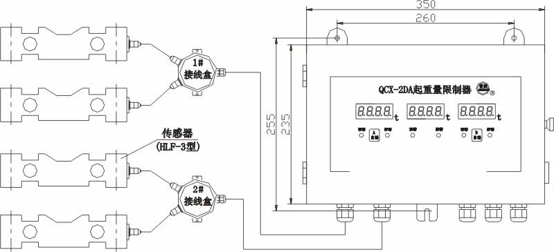 QCX-2DA型起重量限制器具備兩路信號輸入,分顯示分控制,總顯示總控制。例如:總起重量為100t,采用2DA型儀表和4只HLF-3-20t傳感器的訂貨型號為“QCX-2DA-100t/HLF-3-20t(4)”
