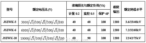 產品符合標準GB1207和IEC186;額定電壓:3 kV、6 kV、10 kV;額定電壓比、額定絕緣水平、準確級次與相應的額定二次負荷見表