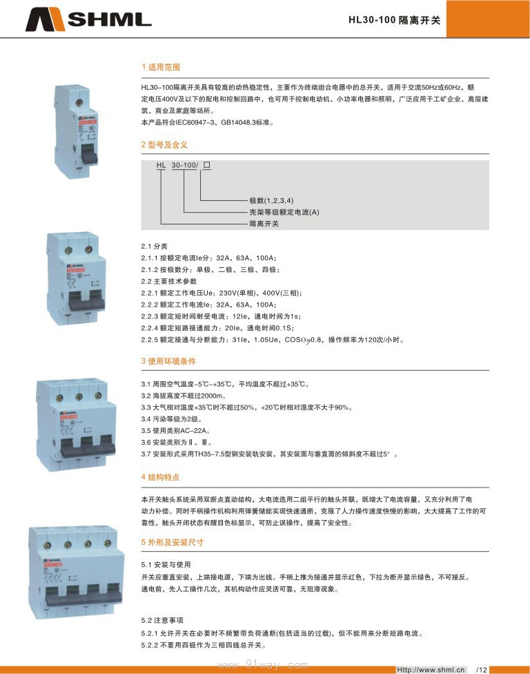 HL30-100系列隔離開關適用于50/60Hz,額定電壓為230/400V,額定工作電流為100以下,在家用