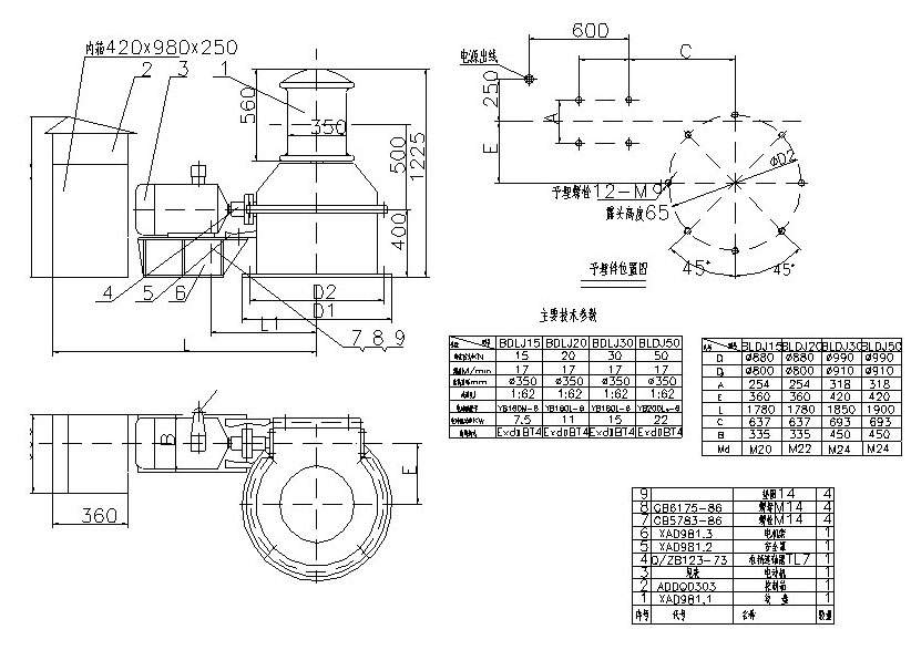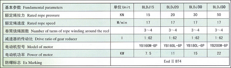 適用范圍 BLDJ-□系列防爆立式絞纜機,其防爆性能按GB3836.1-2000《爆炸性氣體環境用電氣設備 第一部分:通過要求》和GB3836。2-2000《爆炸性氣體環境用電氣設備 第二部分:隔爆型“d”》規定,制成隔爆型,防爆標志為ExdⅡBT4,適用于環境內仿有級別為ⅡA,ⅡB,溫度組別為T1-T4組的可燃性氣體,蒸氣與空氣形成的爆炸性氣體混合物的場所。作船舶靠岸牽引絞纜之用 BLDJ-□系列防爆立式絞纜機型號含義 外形及安裝尺寸