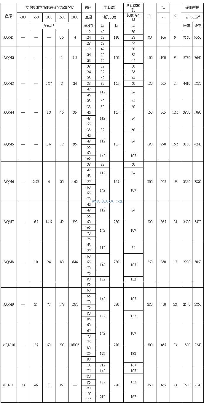 表2 AQM型聯(lián)軸器基本參數(shù)和規(guī)格尺寸