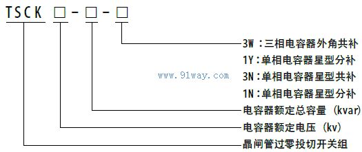 TSCK0.48-30-3W 含義解釋:晶閘管過零投切電容器開關組,采用三相電容器額定電壓480V,三相補償總容量30kvar, 電容器接線方式為外三角,三相共補投切控制方式。