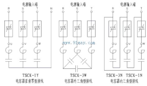 TSCK0.28-30-1Y 含義解釋:晶閘管過零投切電容器開關組,采用單相電容器額定電壓280V,三相補償總容量30kvar,單元支路每相補償容量10kvar, 電容器接線方式為星型接零,單相分補投切控制方式。