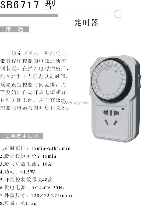 SB6717定時器定時范圍:15min~23h45min 電源: 220V/50Hz