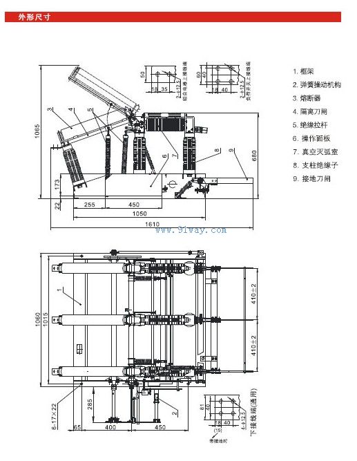 6.1.1本組合電器系三極聯動結構。主要由框架、真空滅弧室、隔離刀閘、熔斷器、接地刀閘、脫扣傳動裝置以及彈簧操動機構組成。隔離刀閘、真空滅弧室通過絕緣子固定于框架上,熔斷器裝在隔離刀閘背面。接地刀閘主軸直接裝在框架下部。彈簧操動機構裝于框架的左側板上,操作方式為側面操作。操動機構驅動開關主軸,主軸轉動并用拐臂通過絕緣操作拉桿帶動真空滅弧室或隔離刀閘動作,實現分閘與合閘的操作。接地刀閘與隔離刀閘通過傳動連桿連在一起,操作時二者聯動。