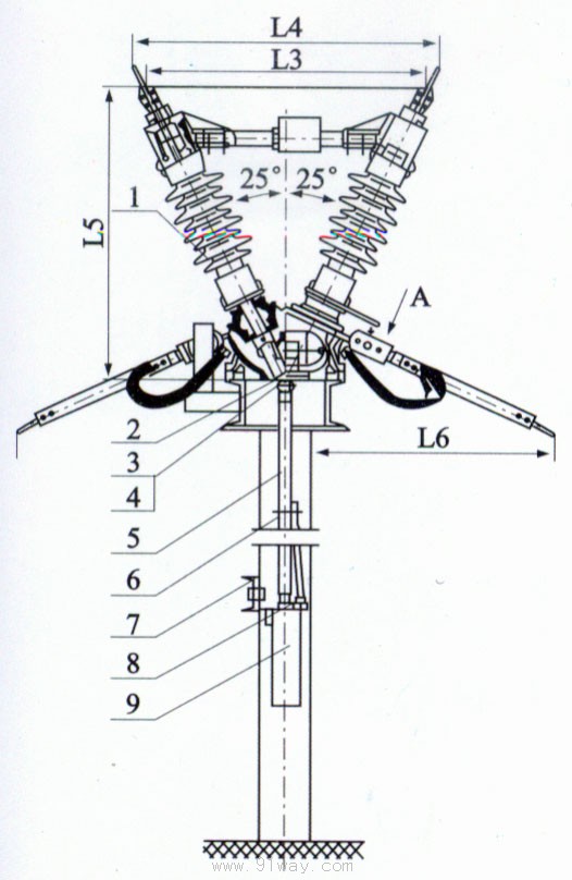 每臺隔離開關單極由兩個支柱絕緣子,分別固定在一個底座上,交角為50°構成V型結構,主要由以下部分組成:底座部分、支柱絕緣子、接線座部分、觸頭部分、接地刀、接地靜觸頭、接線端子等。