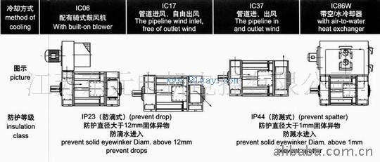 a)電動機的冷卻方式為他冷,根據GB/1993《旋轉電機冷卻方法》標準有IC06、IC07、IC37、IC86W等四種,標準型式的冷卻空氣入口在電動機的主傳動端(非換向器端)。電機的防護等級根據GB/T4942.1《旋轉電機外殼防護分級(IP代碼)》標準有IP23和IP44兩種。用戶如需要其他冷卻方式和防護等級可另行協商。