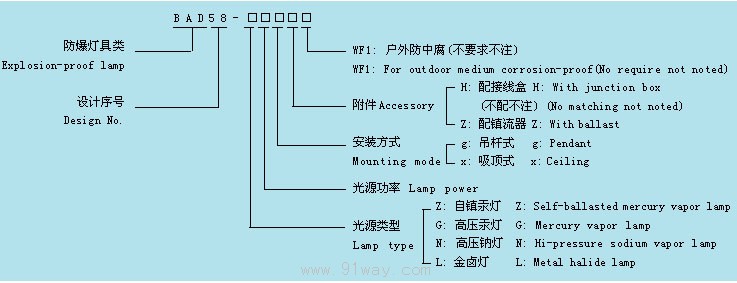 BAD58系列隔爆型防爆燈(Ⅱ B)型號意義: