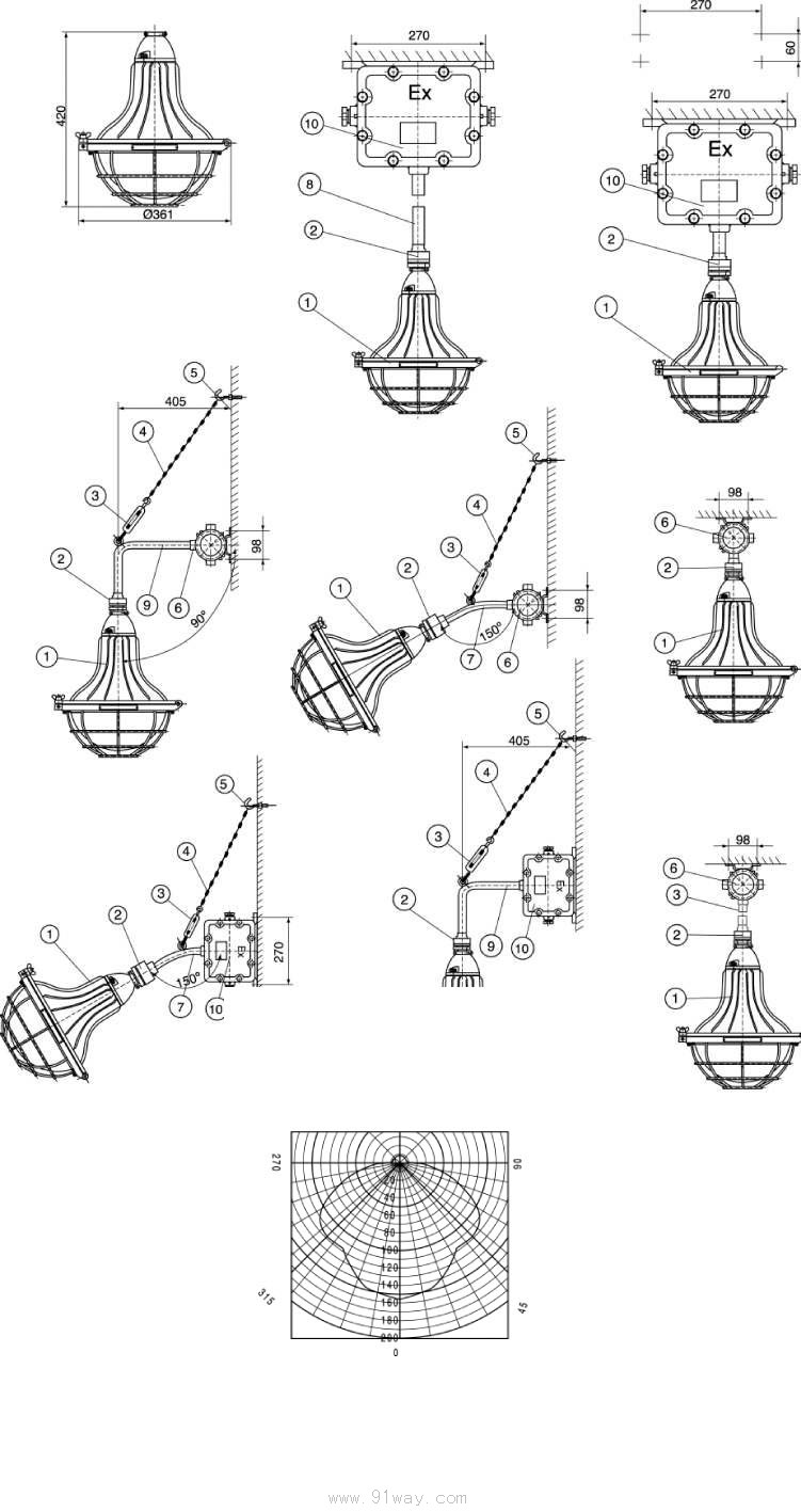 BAD55-e系列增安型防爆燈(e)外形尺寸及安裝示意圖