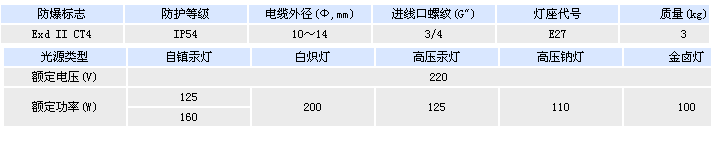 BAD53-系列隔爆型防爆燈(IIB、IIC)適用范圍: 1、1區(qū)、2區(qū)危險(xiǎn)場(chǎng)所。 2、IIA、IIB、IIC類爆炸性氣體環(huán)境。 3、可配裝白熾燈,汞燈,高壓鈉燈,金鹵燈。 4、可按用戶要求配裝燈傘。 產(chǎn)品特點(diǎn): 1、鑄鋁合金外殼,表面噴塑。 2、壓鑄成型,結(jié)構(gòu)緊溱,外形美觀。 3、采用活節(jié)螺栓緊固,能快速開(kāi)啟,便于維修。 4、鋼管布線。 BAD53-系列隔爆型防爆燈(IIB、IIC)型號(hào)意義: 主要技術(shù)參數(shù):