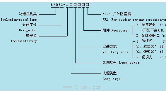 BAD52-e系列增安型防爆防腐燈(e)型號(hào)意義: