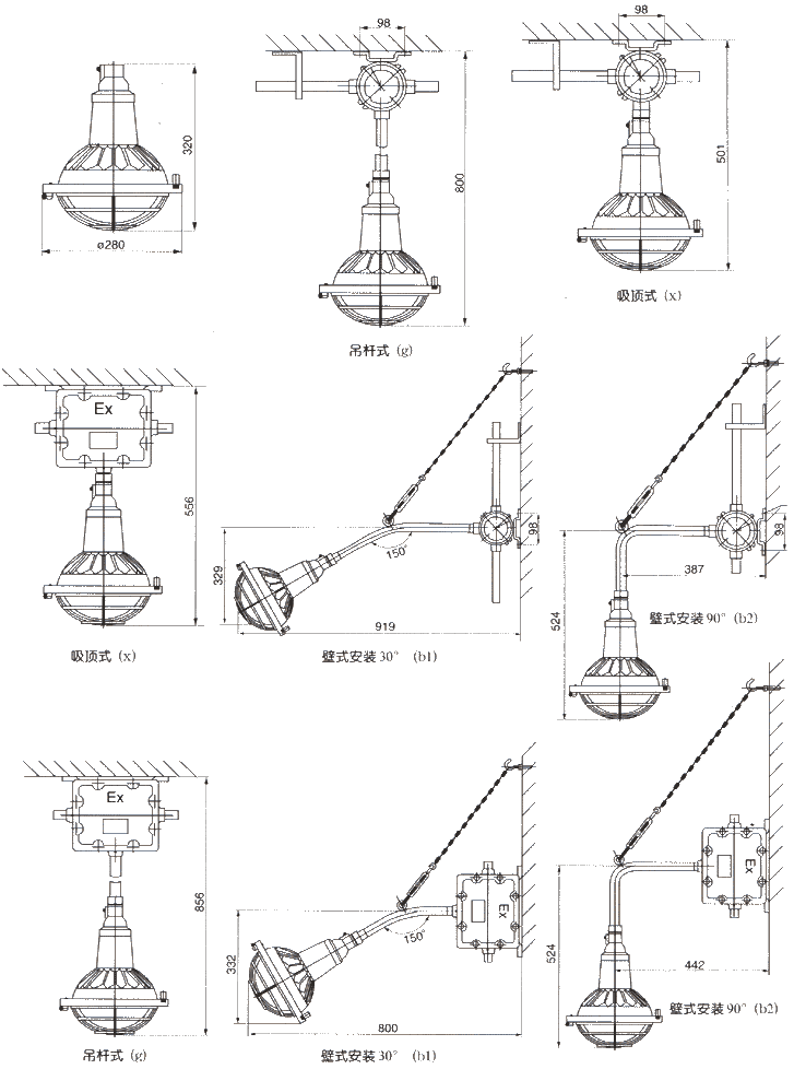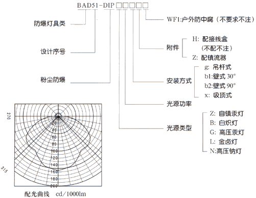 BAD51-DIP系列粉塵防爆燈(DT) 適用范圍: 1、10區、11區危險場所。 2、爆炸性或易燃性粉塵環境。 3、可配裝白熾燈、汞燈金鹵燈、高壓鈉燈。 產品特點: 1、結構輕巧,造型美觀,還具有防水、防塵、防腐等功能。 2、外殼采用優質鋁合金板拉伸成形,表面噴塑。 3、燈罩能快速開啟,便于維修。 4、鋼管布線。 BAD51-DIP系列粉塵防爆燈(DT)型號意義: BAD51-DIP系列粉塵防爆燈(DT)主要技術參數:
