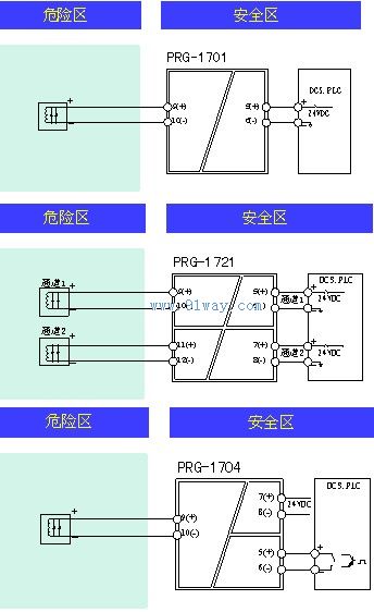 PRG-1701/1721/1704開關量輸出隔離安全柵開關量輸出隔離式安全柵,安全場所一側的觸點開關信號通過安全柵控制或驅動現場本安設備工作,本安設備如電磁閥、聲光報警器等。PRG-1701,PRG-1721輸入輸出隔離性能允許控制開關直接連到24VDC供電回路的任一側。