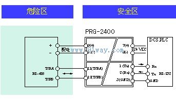PRG-2400型RS485轉(zhuǎn)RS232隔離式安全柵實(shí)現(xiàn)RS485數(shù)字信號(hào)和安全區(qū)的RS232數(shù)字信號(hào)雙向通信,并向現(xiàn)場(chǎng)儀表提供電源。該產(chǎn)品需要獨(dú)立供電,電源、輸入和輸出三隔離。