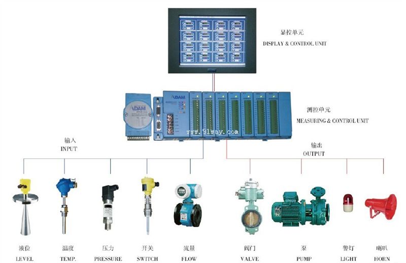 系統可接受來自現場傳感器的各類量值信號,經采集模塊傳送至軟邏輯控制器(PAC),由PAC對這些信號進行計算與處理,通過驅動輸出模塊發出各種顯示、控制、報警信號。同時PAC將信號轉換為數字量,通過多種接口提供給上位機,上位機可以對各種量值、設備狀態及報警信息進行顯示與設置,并完成存儲、指標等功能。
