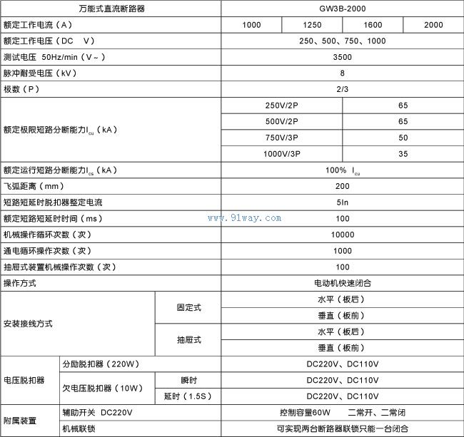 GW3B萬能式直流斷路器適用于額定電壓DC250V~DC1000V,額定電流1000~2000A的直流系統中,用來分配電能和保護線路及電源設備免受過載、欠電壓、短路等的危害。