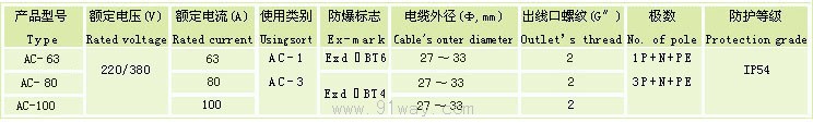 AC系列防爆插接裝置(Ⅱ B)適用范圍: 1、1區(qū)、2區(qū)危險(xiǎn)場(chǎng)所。 2、ⅡA、ⅡB類爆炸性氣體環(huán)境。 產(chǎn)品特點(diǎn): 1、鑄鋁合金外殼,表面噴塑。 2、具有聯(lián)鎖結(jié)構(gòu),只有插座內(nèi)的開關(guān)分?jǐn)嗪蠓侥馨纬霾孱^。 3、電纜或鋼管布線均可。 AC系列防爆插接裝置(Ⅱ B)型號(hào)意義: AC系列防爆插接裝置(Ⅱ B)主要技術(shù)參數(shù):