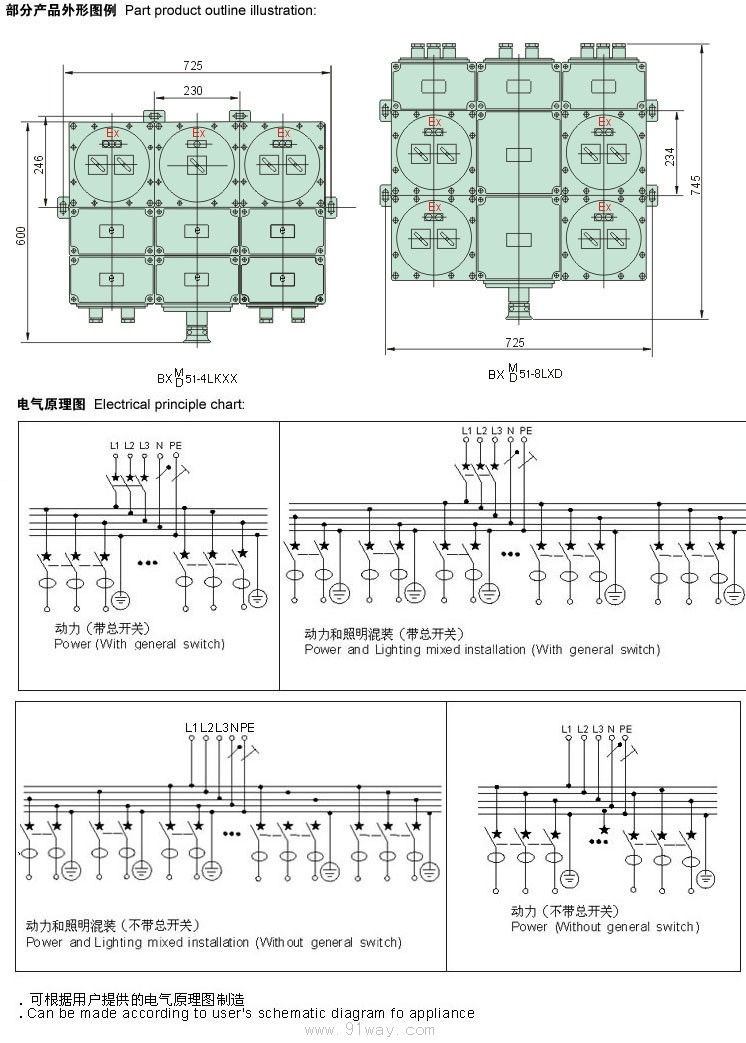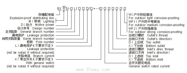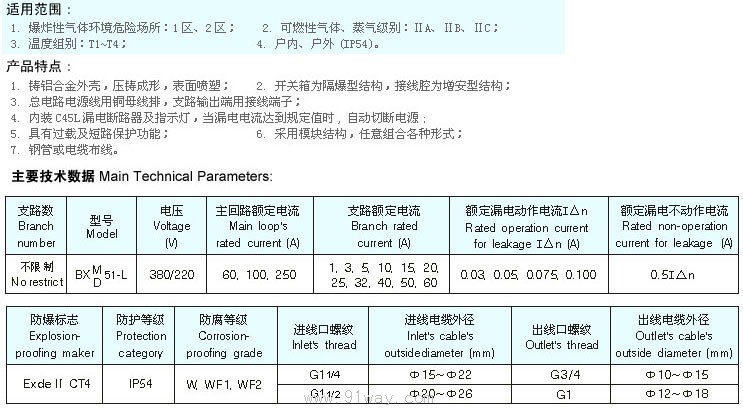 型號意義: 主要技術參數: BXM(D)51-L防爆(照明/動力)配電箱(帶漏電保護)(ⅡB、ⅡC)