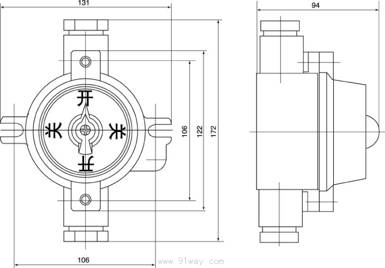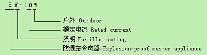 適用范圍: 1、1區、2區危險場所。 2、ⅡA、ⅡB類爆炸性氣體環境。 產品特點: 1、鑄鋁合金外殼,表面噴塑。 2、增安型外殼,內部元件采用隔爆型開關。 3、產品具有防水、防塵等特點。 4、鋼管或電纜布線均可。 SW-10系列防爆照明開關(Ⅱ B)型號意義: