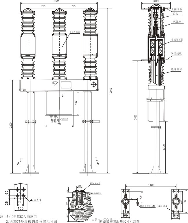 斷路器可帶LR□-40.5內置電流互感器,每臺電流互感器可提供多小只,其接線方案見互感器銘牌及電氣接線圖,主要技術參數