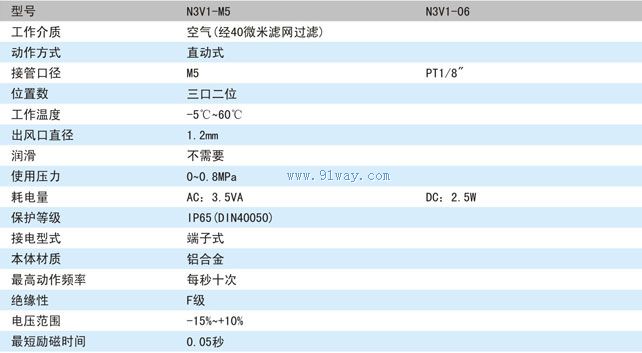 3V1系列電磁閥適用于工作溫度-5℃~60℃,電源電壓為DC12V~24V、AC24V~380V、50~60Hz、介質為經過過濾干燥的清潔空氣、工作壓力為0~0.8MPa。N3V1系列電磁閥廣泛應用于氣動系統中,用來控制執行元件或儲能元件的充、排氣動作。頻率不大于10次/s,流量不大于120L/min。