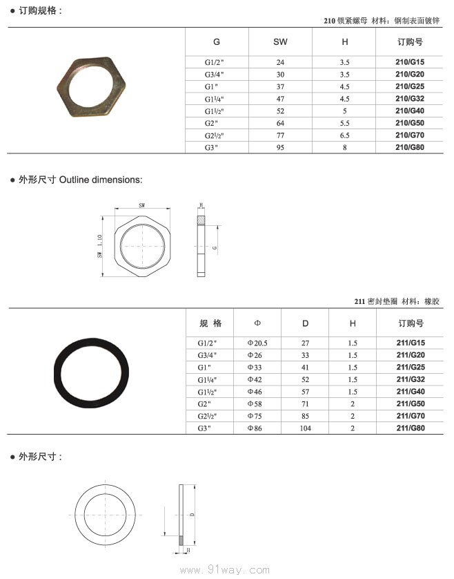 210 鎖緊螺母,211 密封墊圈