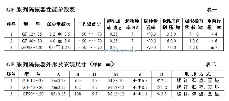 GF12~35;GF40~80;GF90~120單只承載范圍12㎏至120㎏的三種規格GF系列隔振器。