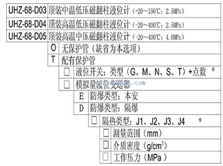 | 產(chǎn)品名稱: | UHZ68-D03/D05頂裝中高溫中低壓型磁翻板液位計 | |||||