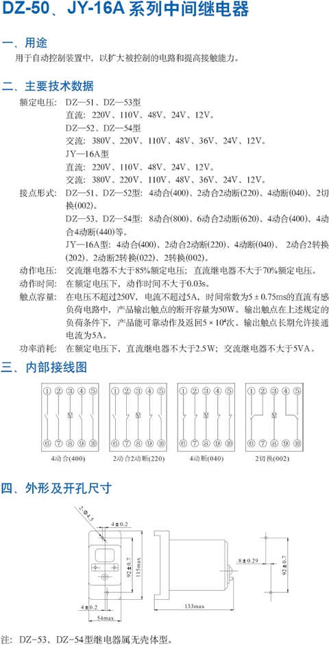 JY-16A型中間繼電器主要用于直流或交流電壓操作的電梯自動控制裝置中,用以增加被控電路觸點的數量和容量。