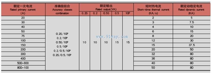 6額定一次電流、準確級組合、額定輸出及額定動、熱穩定電流見下表