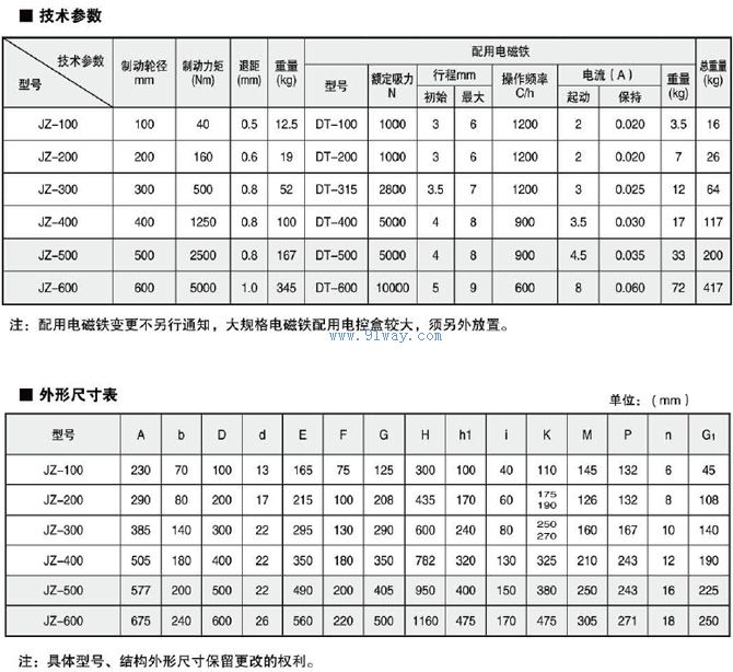 JZ系列電磁鼓式制動器連接尺寸和制動力矩參數符合JB/ZQ4388-86標準,技術要求符合JB/7685-2006標準;