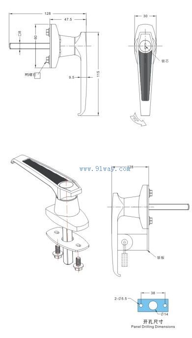 MS315-1把手電柜門鎖材質 鍍鉻鋅合金把手、基座、鎖芯,鍍鋅鋼轉軸,不銹鋼鎖板 表面處理 鍍鉻、鍍鋅、不銹鋼